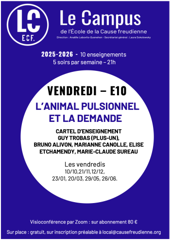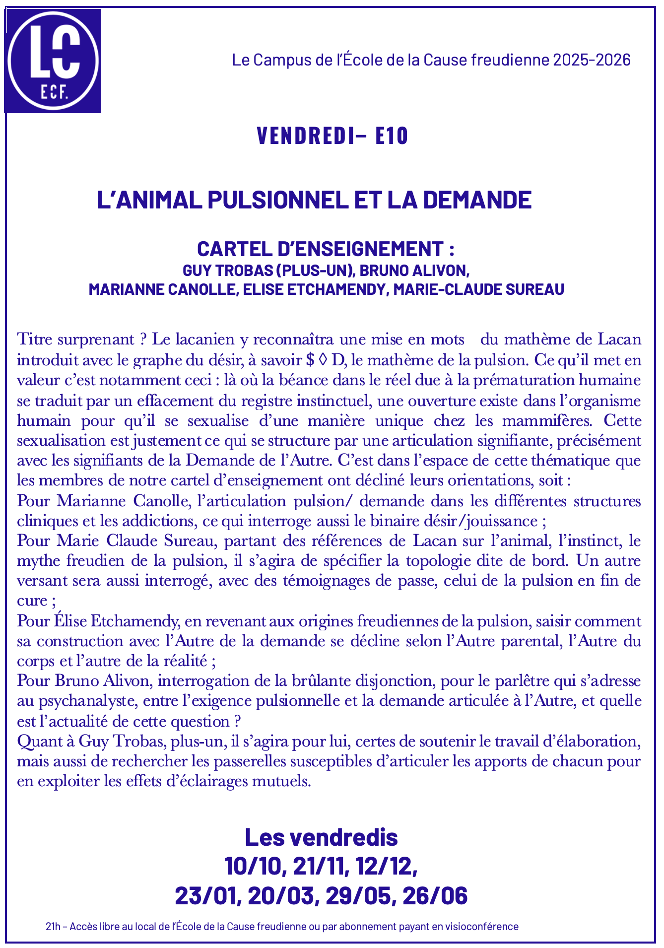 Titre surprenant ? Le lacanien y reconnaître une mise en mots du mathème de Lacan introduit avec le graphe du désir, à savoir S barré poinçon grand D, le mathème de la pulsion. Lire la suite